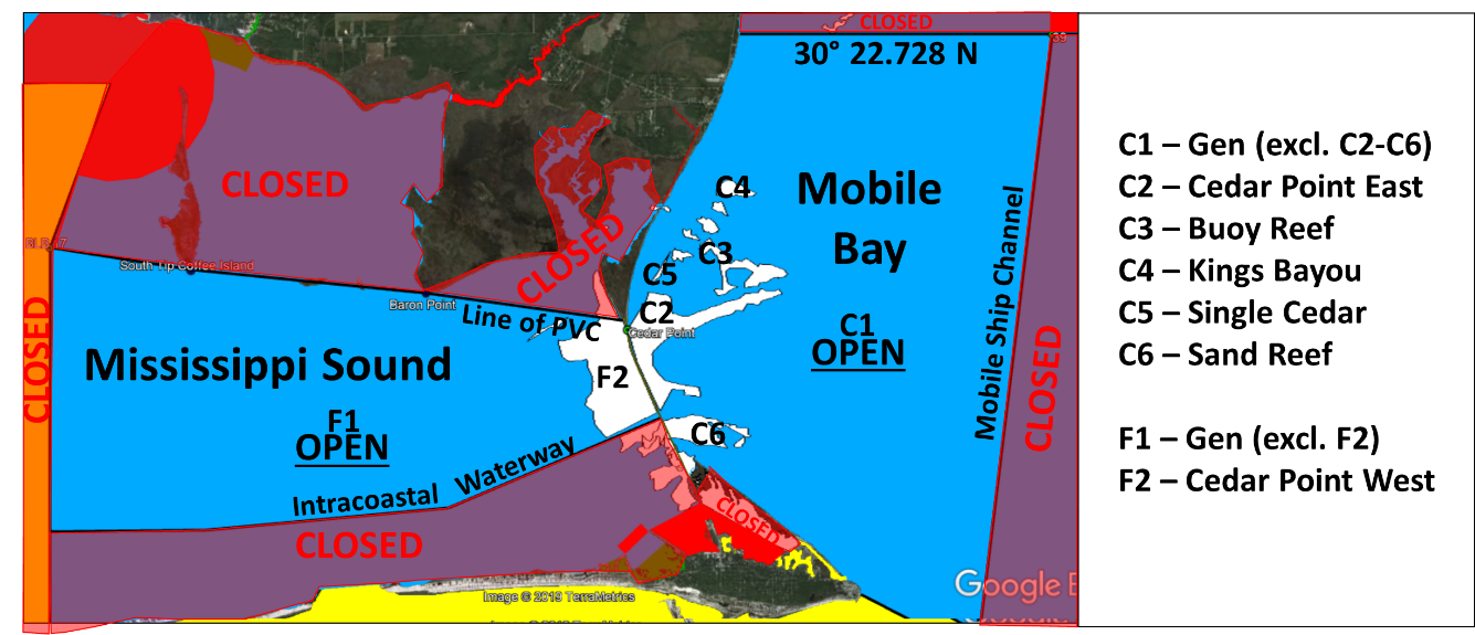 - All of Zone C - including Cedar Point East, Buoy Reef and King’s Bayou south of Latitude 30°22.728N