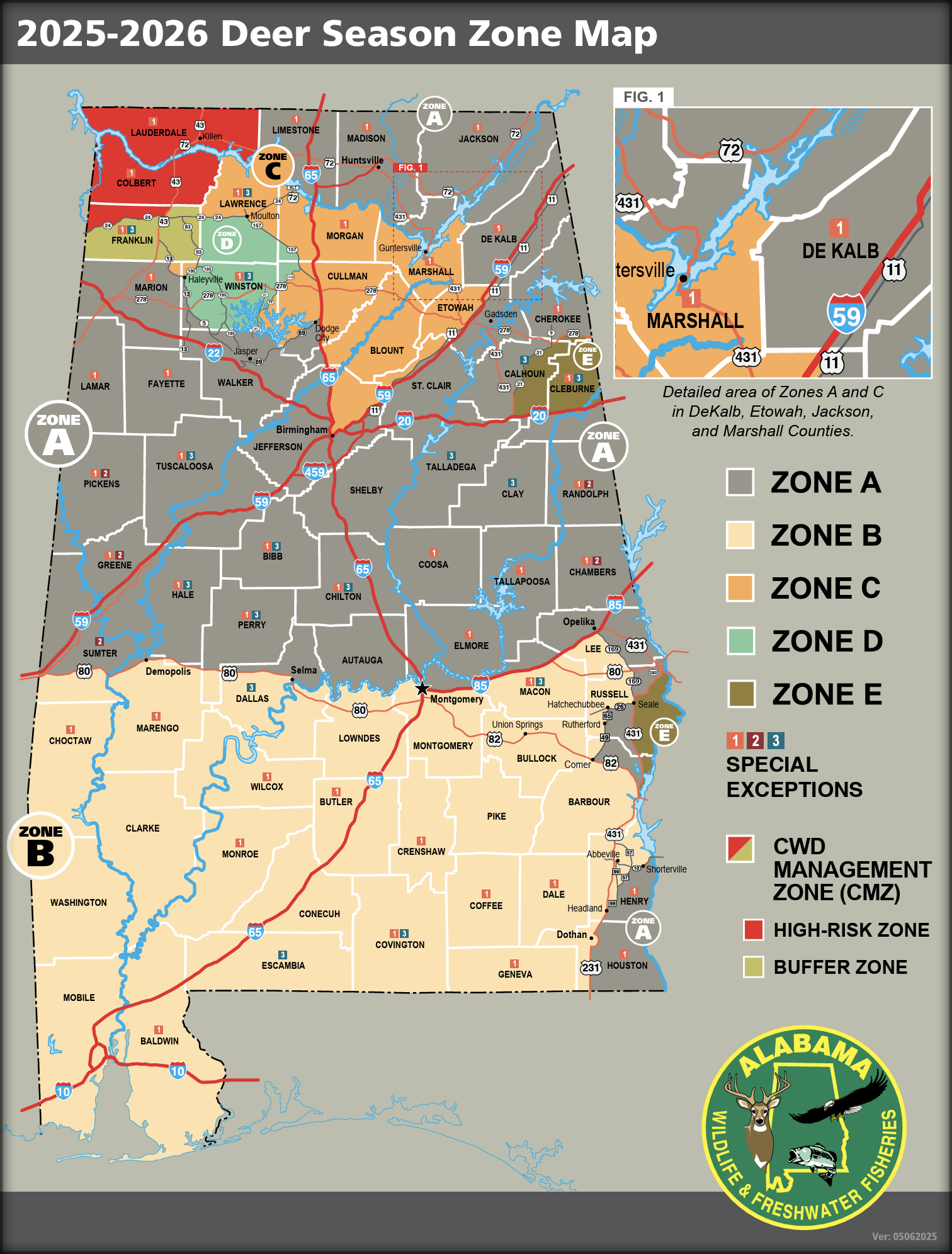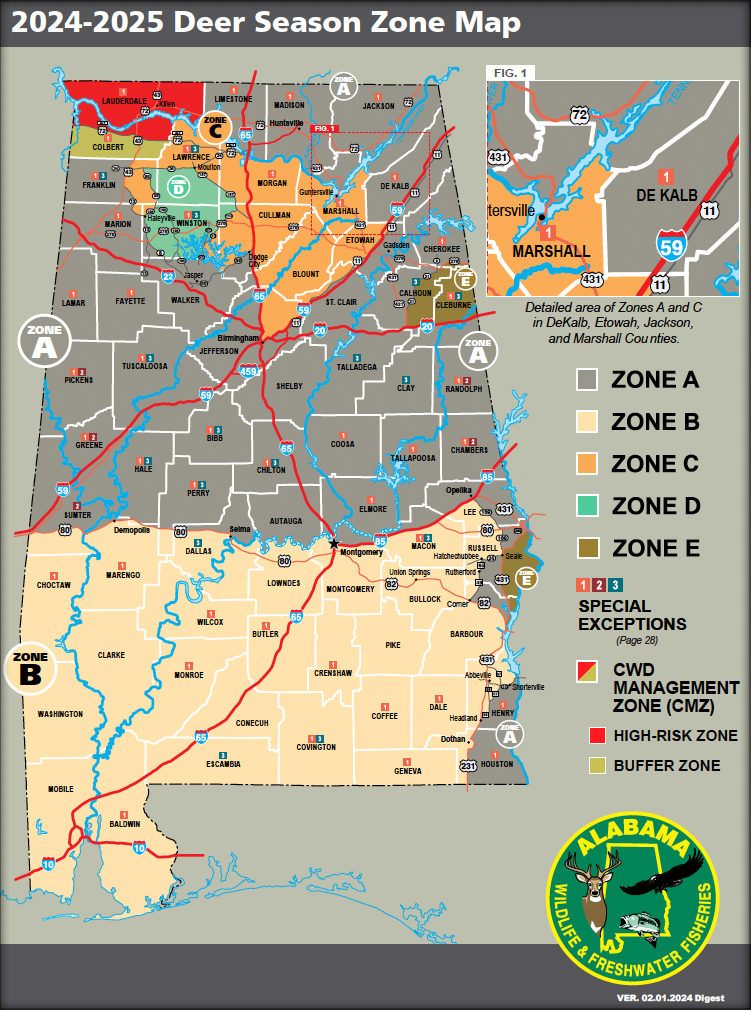 EXCEPTIONS: 1.) BARBOUR COUNTY ANTLER RESTRICTION – white-tailed deer antlered bucks must have a minimum of three points on one side, (except on the statewide special youth deer hunting dates during which any antlered buck may be taken). 2.) WILDLIFE MANAGEMENT AREA (WMA) BONUS BUCK – One per hunter during all combined bonus buck hunt dates will be allowed to be harvested from a selected collection of WMA’s on specific hunt dates depicted on the WMA map permits that will not count towards the hunter's State three buck limit. Must be validated at the WMA check station by WFF personnel.